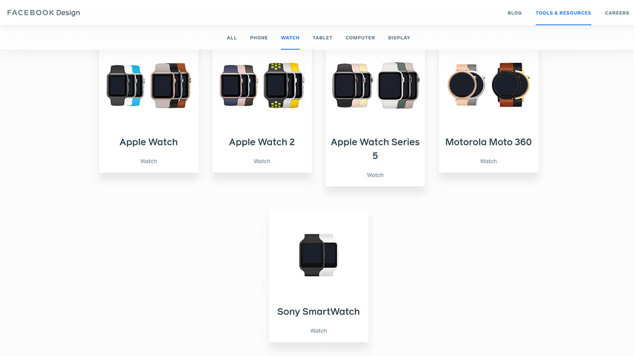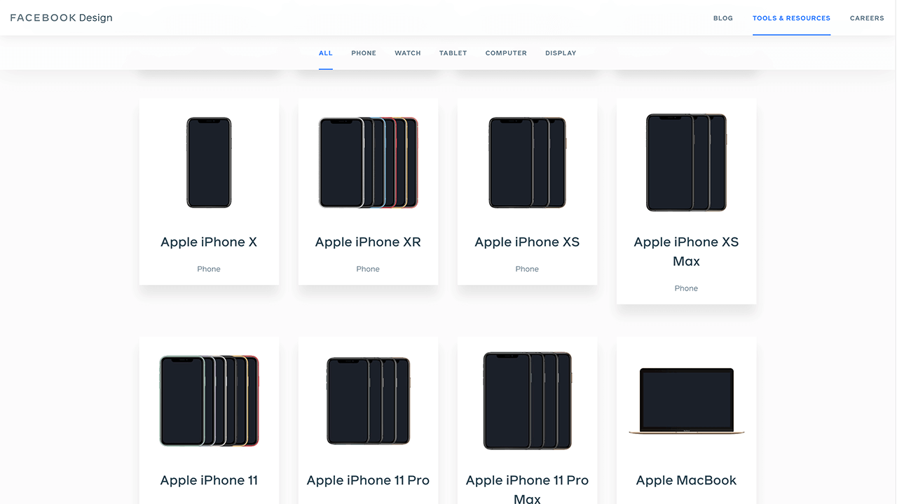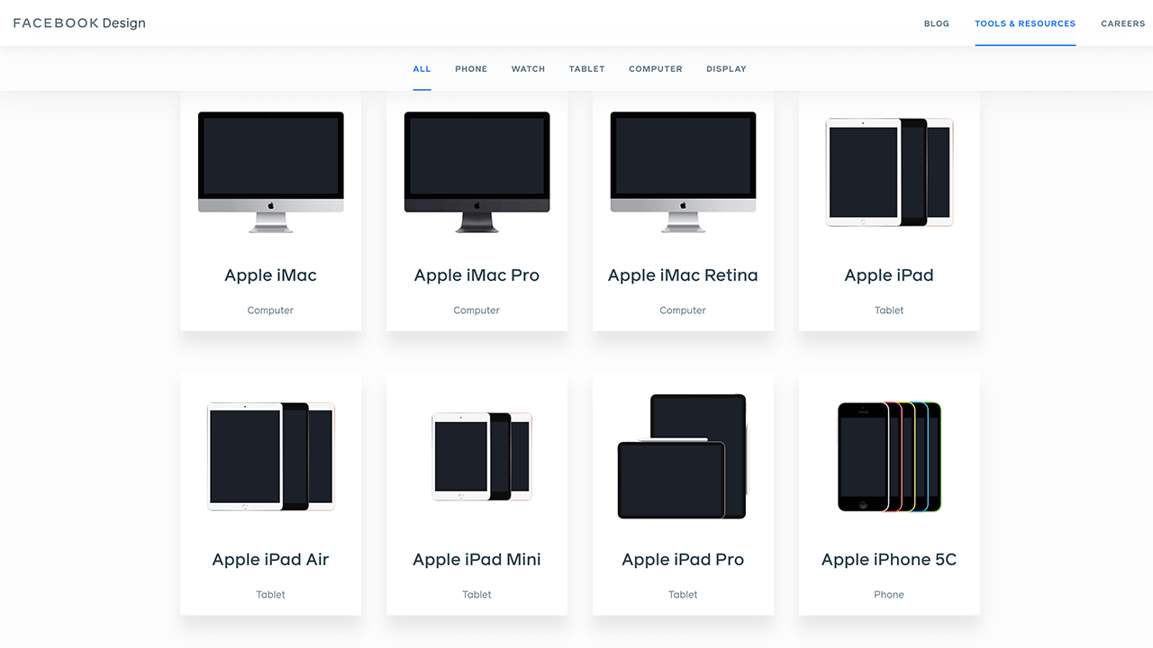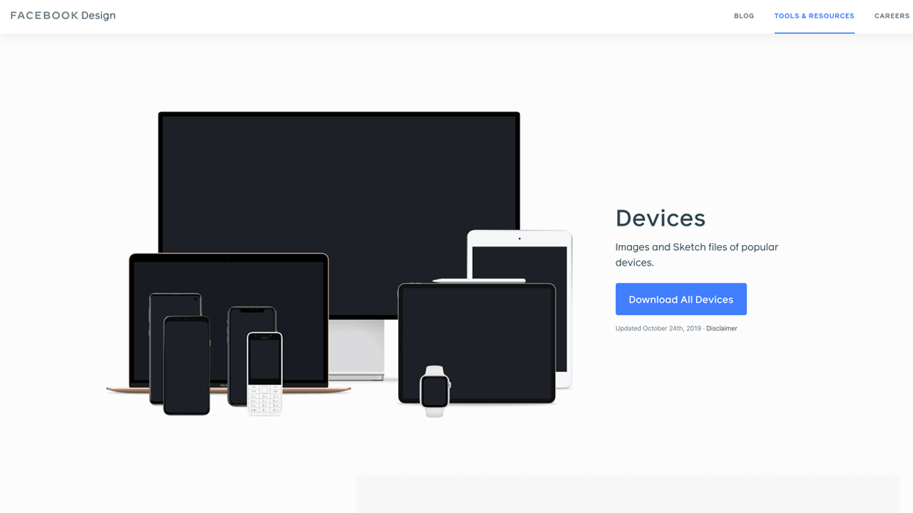 打开网站,就可以直接下载流行设备的样机模型,Facebook支持世界各地的不同受众以及同样多样化的设备,每个设备模型都提供了sketch文件。