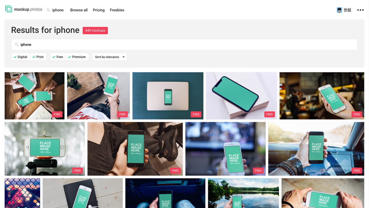 同时这里还提供了搜索入口,比如搜索iPhone就可以找到很多免费的不同场景的样机模型,有数码、印刷、免费等勾选的入口。